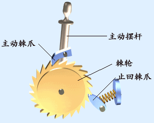 我們先來通過圖片了解主動棘爪、棘輪、主動擺桿、止回棘爪在四個部分,當順時針擺動的時候,棘爪便會插入棘輪的齒槽中,棘輪跟隨轉動,止回棘爪從齒背上滑動;當逆時針轉動時,止回棘爪便會死死的卡住齒槽,禁止其逆行。