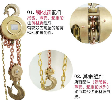 鏈條、導(dǎo)輪、吊鉤等材質(zhì)的制造材料為鈹青銅或者是鋁青銅,顏色深黃,不易斷裂、不易變形、抗擠壓能力強(qiáng),防爆等級(jí)更高,在和其他機(jī)械設(shè)備、地面等物種接觸時(shí)不會(huì)產(chǎn)生火花。