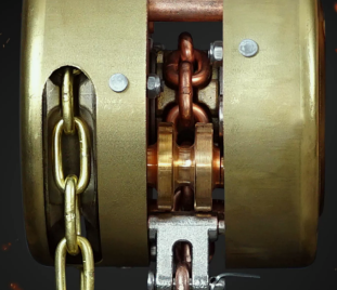 還有一部分零部件使用的是H62黃銅,這些零部件包括左右墻板、手拉鏈條、擋板、罩殼。其余的起重鏈條、四齒軸成套、支桿部件使用的是鋼質(zhì)鍍銅材料。